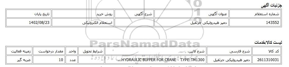 | 143552 | دمپر هیدرولیکی جرثقیل | استعلام الکترونیکی | 1402/08/23 |
