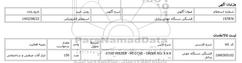 | 157876 | فشنگی دستگاه جوش پرتابل | استعلام الکترونیکی | 1402/08/22 |