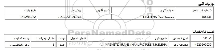 156131مجموعه ترمز" T.H.ELEMA "استعلام الکترونیکی1402/08/22