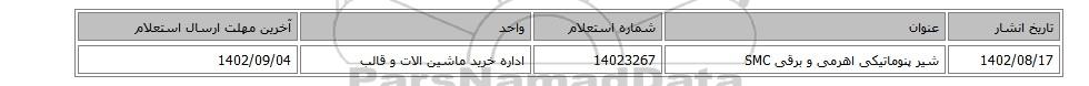 | 1402/08/17 | شیر پنوماتیکی اهرمی و برقی SMC | 14023267 | اداره خرید ماشین الات و قالب | 1402/09/04 |