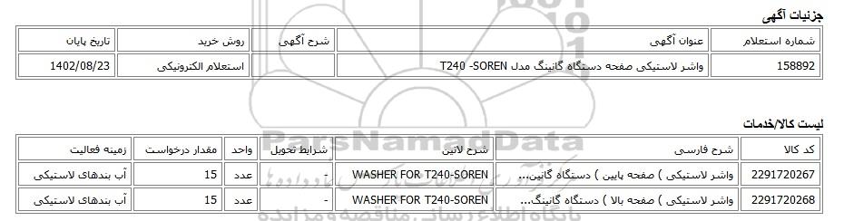 | 158892 | واشر لاستیکی صفحه دستگاه گانینگ مدل T240 -SOREN | استعلام الکترونیکی | 1402/08/23 |
