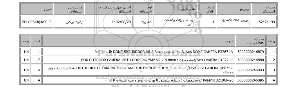 | 52474199 | دوربین های اکسیژن 3 | 4 | خرید تجهیزات وقطعات یدکی | کشوری | 1402/08/29 | زهره اورکی | ZO.ORAKI@KSC.IR |