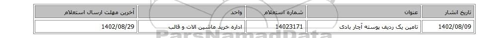 | 1402/08/09 | تامین یک ردیف پوسته آچار بادی | 14023171 | اداره خرید ماشین الات و قالب | 1402/08/29 |