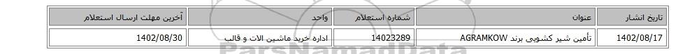 | 1402/08/17 | تأمین شیر کشویی برند AGRAMKOW | 14023289 | اداره خرید ماشین الات و قالب | 1402/08/30 |