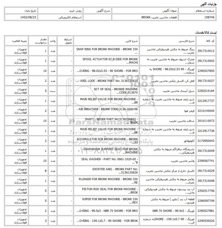 | 158746 | قطعات ماشین تخریب BROKK | استعلام الکترونیکی | 1402/08/23 |
