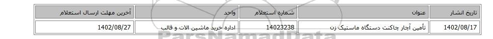 | 1402/08/17 | تأمین آچار چاکنت دستگاه ماستیک زن | 14023238 | اداره خرید ماشین الات و قالب | 1402/08/27 |