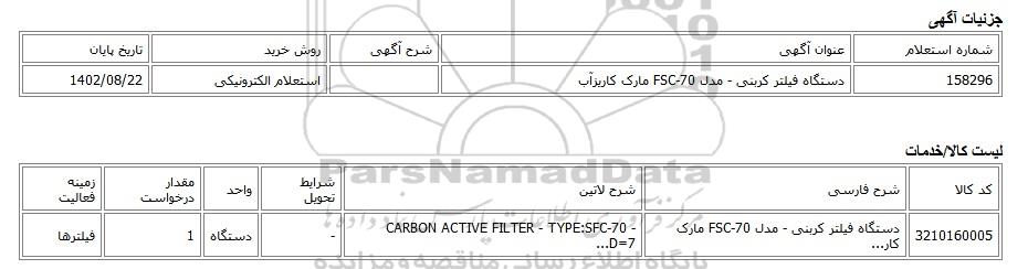 158296دستگاه فیلتر کربنی - مدل FSC-70 مارک کاریزآباستعلام الکترونیکی1402/08/22