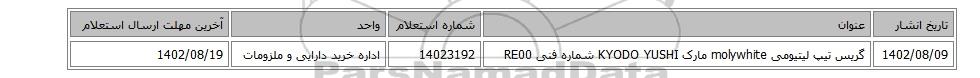 | 1402/08/09 | گریس تیپ لیتیومی molywhite مارک KYODO YUSHI شماره فنی RE00 | 14023192 | اداره خرید دارایی و ملزومات | 1402/08/19 |