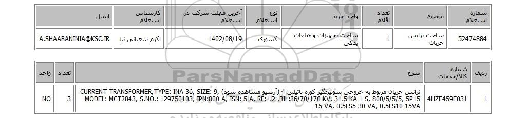 52474884ساخت ترانس جریان 1ساخت تجهیزات و قطعات یدکیکشوری1402/08/19اکرم شعبانی نیاA.SHAABANINIA@KSC.IR