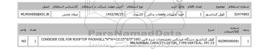 | 52474893 | کویل کندانسور | 1 | خرید تجهیزات وقطعات یدکی | کشوری | 1402/08/25 | میلاد محبی | MI.MOHEBI@KSC.IR |