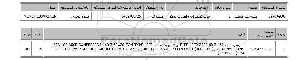| 52474930 | کمپرسور کوپلند | 1 | خرید تجهیزات وقطعات یدکی | کشوری | 1402/08/25 | میلاد محبی | MI.MOHEBI@KSC.IR |