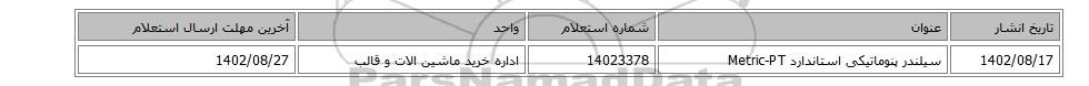 | 1402/08/17 | سیلندر پنوماتیکی استاندارد Metric-PT | 14023378 | اداره خرید ماشین الات و قالب | 1402/08/27 |