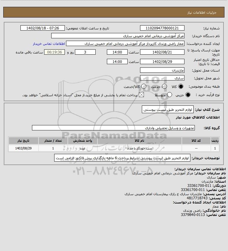 شرح کلی نیاز: لوازم التحریر طبق لیست پیوستی
