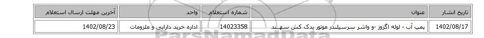 | 1402/08/17 | پمپ آب - لوله اگزوز -و واشر سرسیلندر موتور یدک کش سهــند | 14023358 | اداره خرید دارایی و ملزومات | 1402/08/23 |
