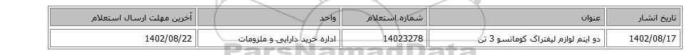 | 1402/08/17 | دو ایتم لوازم لیفتراک کوماتسو 3 تن | 14023278 | اداره خرید دارایی و ملزومات | 1402/08/22 |