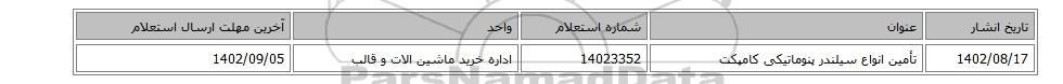 | 1402/08/17 | تأمین انواع سیلندر پنوماتیکی کامپکت | 14023352 | اداره خرید ماشین الات و قالب | 1402/09/05 |
