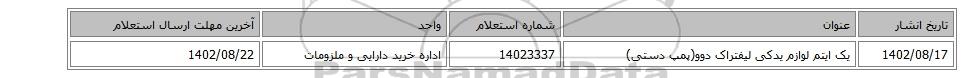 | 1402/08/17 | یک ایتم لوازم یدکی لیفتراک دوو(پمپ دستی) | 14023337 | اداره خرید دارایی و ملزومات | 1402/08/22 |