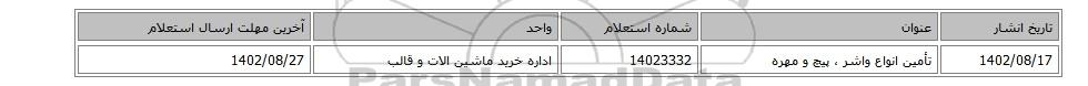 | 1402/08/17 | تأمین انواع واشر ، پیچ و مهره | 14023332 | اداره خرید ماشین الات و قالب | 1402/08/27 |