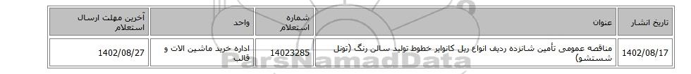 1402/08/17مناقصه عمومی تأمین شانزده ردیف انواع ریل ‎کانوایر خطوط تولید سالن رنگ (تونل شستشو)14023285اداره خرید ماشین الات و قالب1402/08/27
