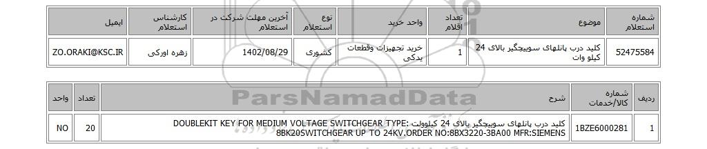 | 52475584 | کلید درب پانلهای سوییچگیر بالای 24 کیلو وات | 1 | خرید تجهیزات وقطعات یدکی | کشوری | 1402/08/29 | زهره اورکی | ZO.ORAKI@KSC.IR |