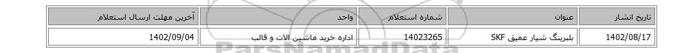 | 1402/08/17 | بلبرینگ شیار عمیق SKF | 14023265 | اداره خرید ماشین الات و قالب | 1402/09/04 |