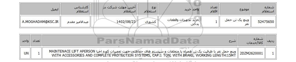 52475650وینچ یک تن حمل نفر1خرید تجهیزات وقطعات یدکیکشوری1402/08/23عبدالامیر مقدمA.MOGHADAM@KSC.IR