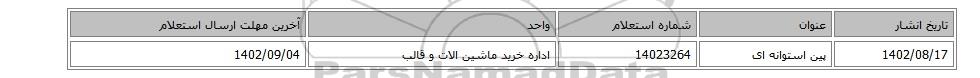 | 1402/08/17 | پین استوانه ای | 14023264 | اداره خرید ماشین الات و قالب | 1402/09/04 |