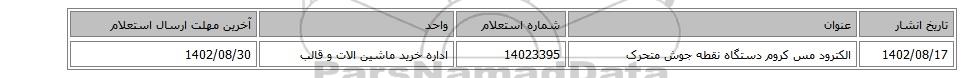 | 1402/08/17 | الکترود مس کروم دستگاه نقطه جوش متحرک | 14023395 | اداره خرید ماشین الات و قالب | 1402/08/30 |