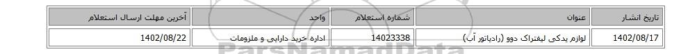 | 1402/08/17 | لوازم یدکی لیفتراک دوو (رادیاتور آب) | 14023338 | اداره خرید دارایی و ملزومات | 1402/08/22 |