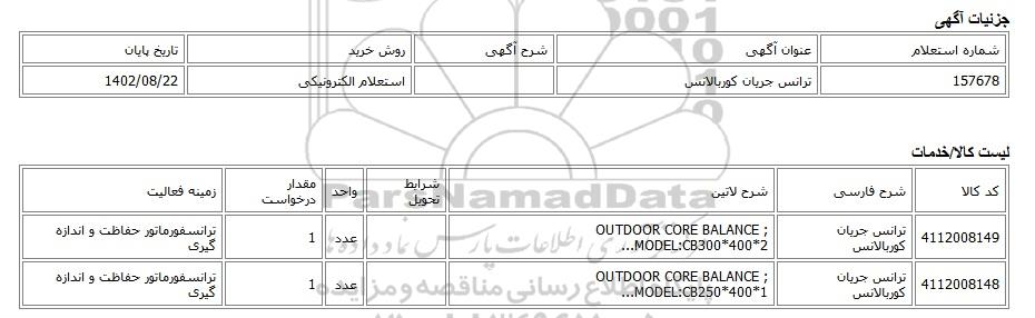 | 157678 | ترانس جریان کوربالانس | استعلام الکترونیکی | 1402/08/22 |