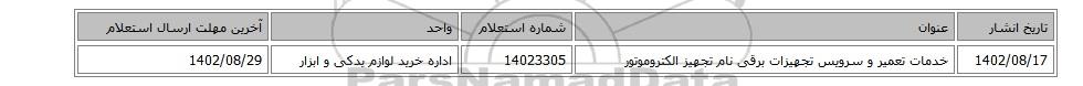 | 1402/08/17 | خدمات تعمیر و سرویس تجهیزات برقی نام تجهیز الکتروموتور | 14023305 | اداره خرید لوازم یدکی و ابزار | 1402/08/29 |
