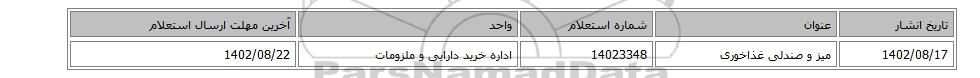 | 1402/08/17 | میز و صندلی غذاخوری | 14023348 | اداره خرید دارایی و ملزومات | 1402/08/22 |