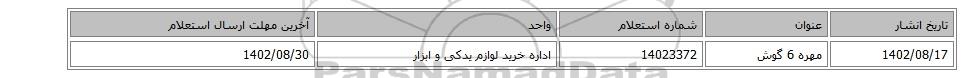 | 1402/08/17 | مهره 6 گوش | 14023372 | اداره خرید لوازم یدکی و ابزار | 1402/08/30 |