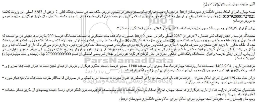 شعبه چهارم اجرای احکام مدنی دادگستری شهرستان اردبیل درنظردارد جهت اجرای حکم صادره مبنی بر دستور فروش ملک مشاعی بشماره پلاک ثبتی 7 فرعی از 2287 اصلی در پرونده کلاسه 140107920001727821 یک باب ساختمان واقع در اردبیل به نشانی خیابان جمهوری اسلامی ایران ،کوچه صاحبقران فرد کوچه فلسفی 4 را با مشخصات ذیل ، از طریق برگزاری مزایده عمومی به فروش برساند: