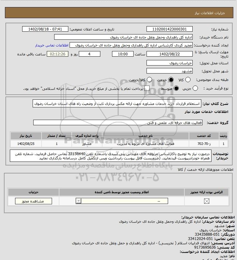 نام دستگاه خریدار:اداره کل راهداری وحمل ونقل جاده ای خراسان رضوی