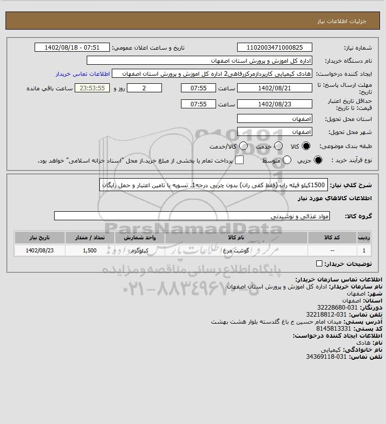 شرح کلی نیاز: 1500کیلو فیله ران (فقط کفی ران) بدون چربی درجه1. تسویه با تامین اعتبار و حمل رایگان