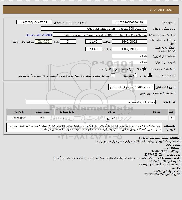 شرح کلی نیاز: تخم مرغ 200 کیلو با تاریخ تولید به روز