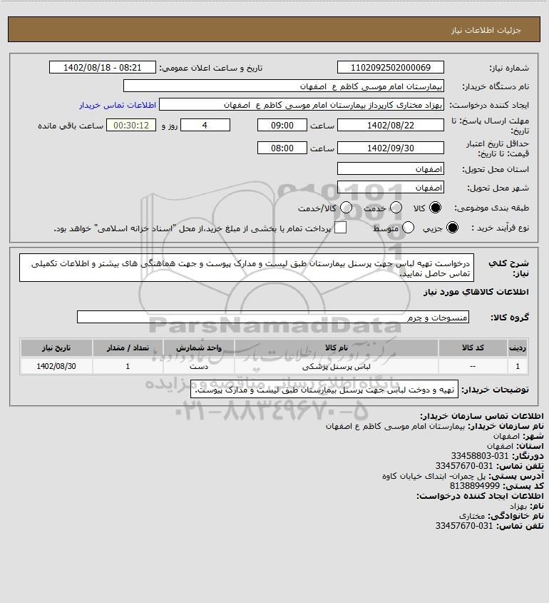 شرح کلی نیاز: درخواست تهیه لباس جهت پرسنل بیمارستان طبق لیست و مدارک پیوست و جهت هماهنگی های بیشتر و اطلاعات تکمیلی تماس حاصل نمایید.