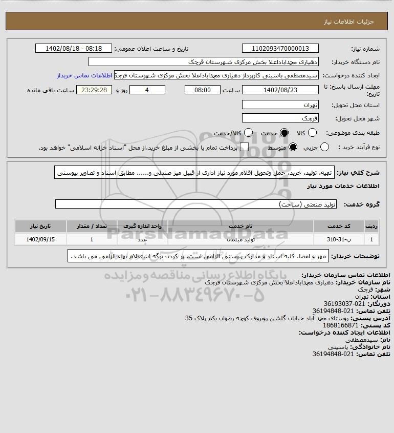 شرح کلی نیاز: تهیه، تولید، خرید، حمل وتحویل اقلام مورد نیاز اداری از قبیل میز صندلی و...... مطابق اسناد و تصاویر پیوستی