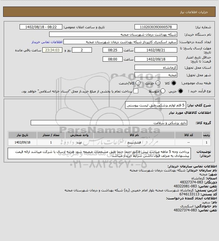 شرح کلی نیاز: 5 قلم لوازم پزشکی طبق لیست پیوستی