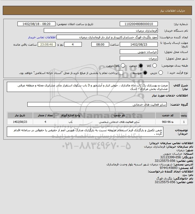 شرح کلی نیاز: مرمت و بهسازی یک باب چاه مالداری ، حوض انبار و آبشخور و 3 باب سکوی استقرار چادر عشایری محله و منطقه عرفی عشایری بخش مرکزی - اشک