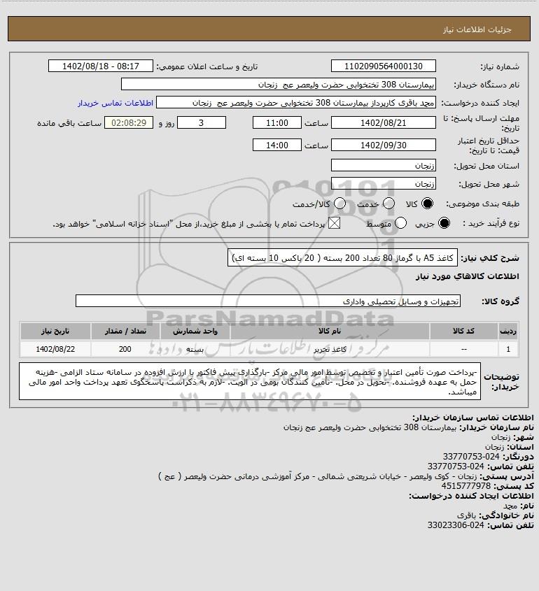 شرح کلی نیاز: کاغذ A5 با گرماژ 80 تعداد 200 بسته ( 20 باکس 10 بسته ای)