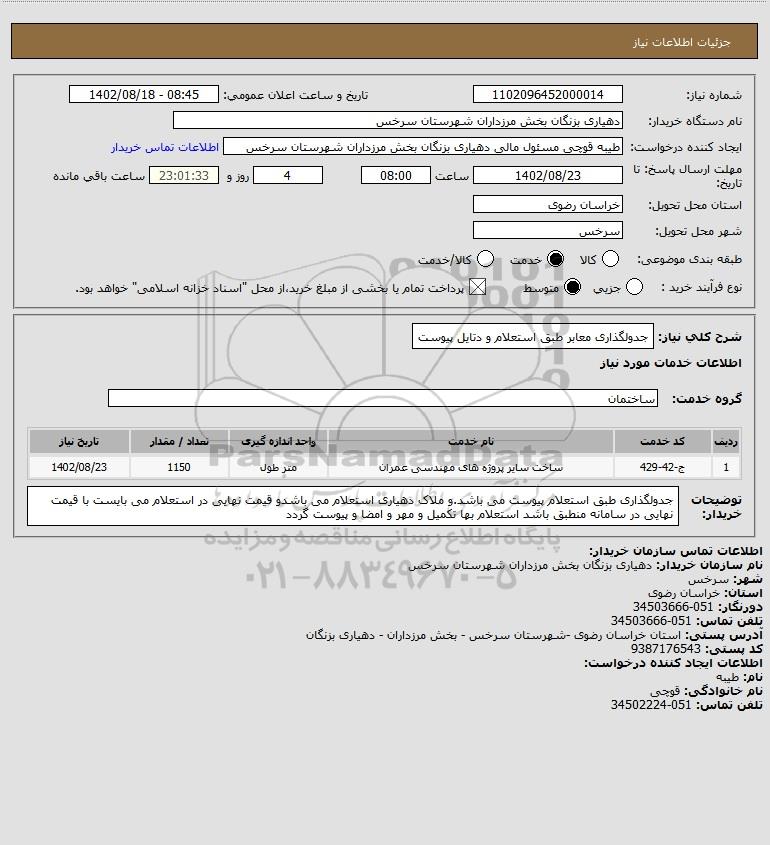 شرح کلی نیاز: جدولگذاری معابر طبق استعلام و دتایل پیوست