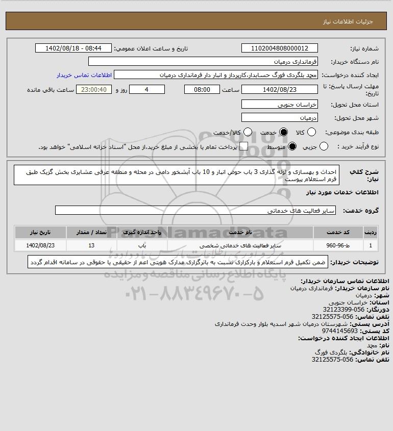 استعلام احداث و بهسازی و لوله گذاری 3 باب حوض انبار و 10 باب آبشخور دامی در محله و منطقه عرفی عشایری بخش گزیک طبق فرم استعلام پیوست, استعلام احداث و بهسازی و لوله گذاری 3 باب حوض انبار و 10 باب آبشخور دامی در محله و منطقه عرفی عشایری بخش گزیک طبق فرم استعلام پیوست