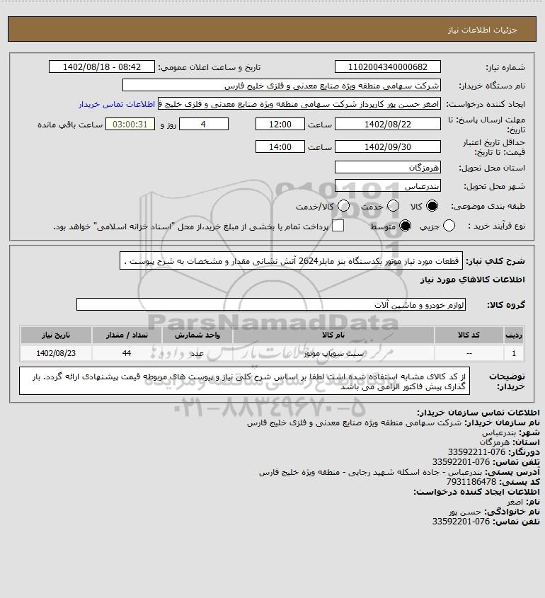 شرح کلی نیاز: قطعات مورد نیاز موتور یکدستگاه بنز مایلر2624 آتش نشانی مقدار و مشخصات به شرح پیوست .