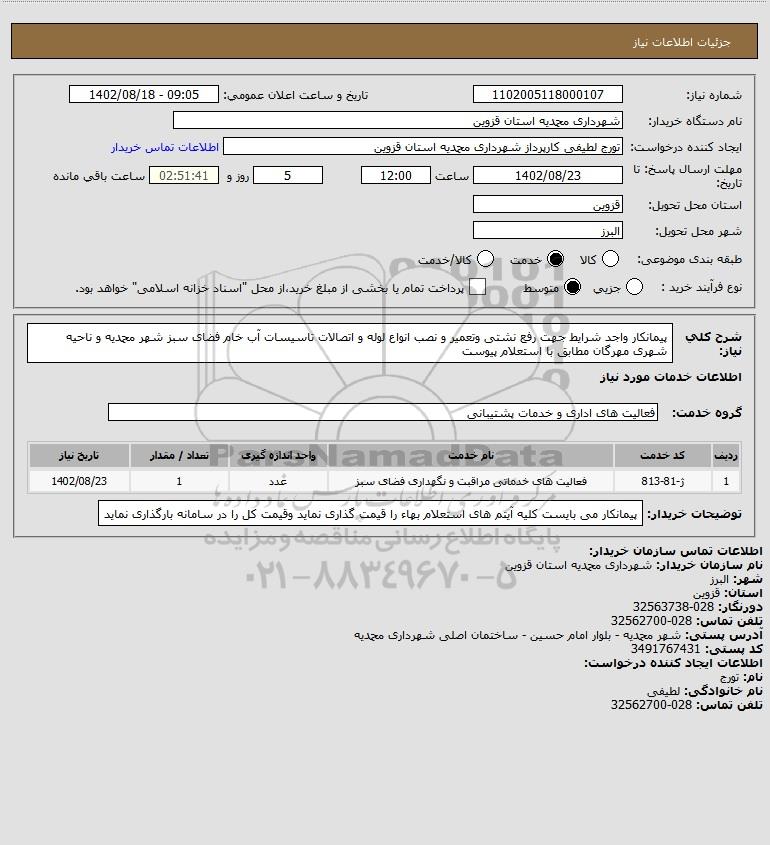شرح کلی نیاز: پیمانکار واجد شرایط جهت رفع نشتی وتعمیر و نصب انواع لوله و اتصالات تاسیسات آب خام فضای سبز شهر محمدیه و ناحیه شهری مهرگان مطابق با استعلام پیوست