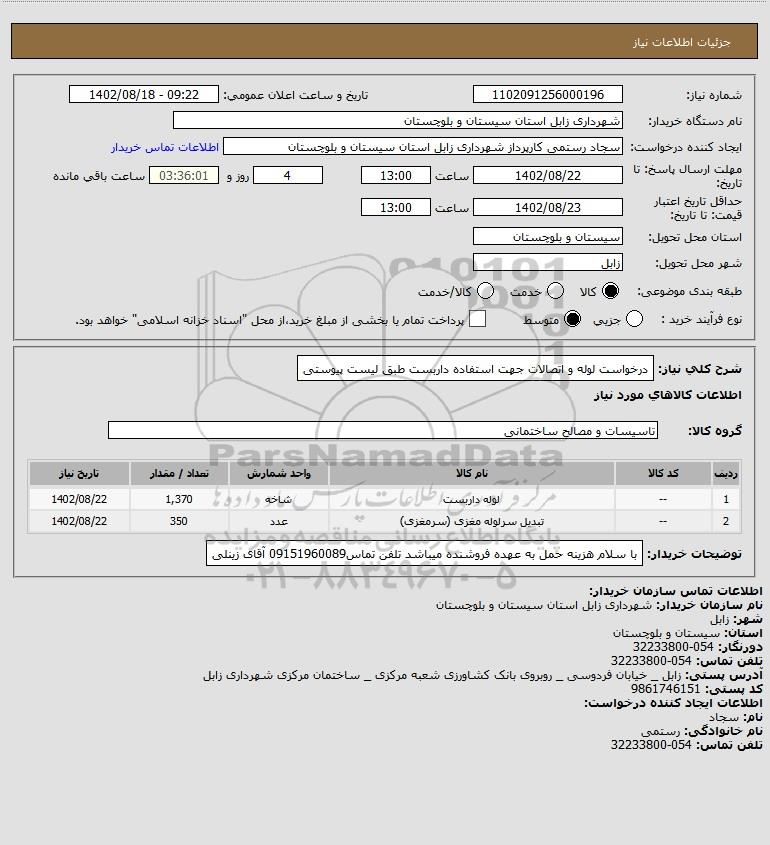 شرح کلی نیاز: درخواست لوله و اتصالات جهت استفاده داربست طبق لیست پیوستی