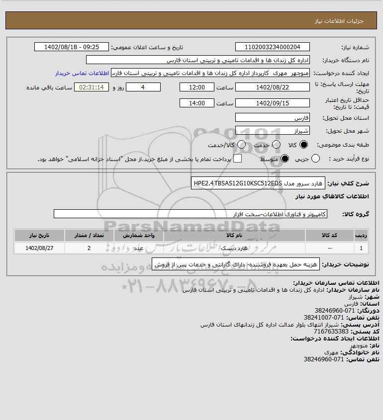 شرح کلی نیاز: هارد سرور مدل HPE2.4TBSAS12G10KSC512EDS