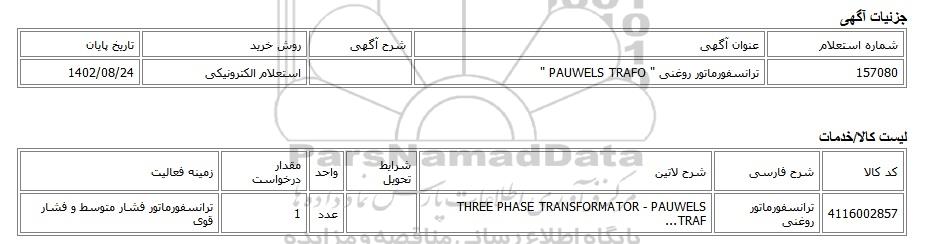 157080ترانسفورماتور روغنی " PAUWELS TRAFO "استعلام الکترونیکی1402/08/24