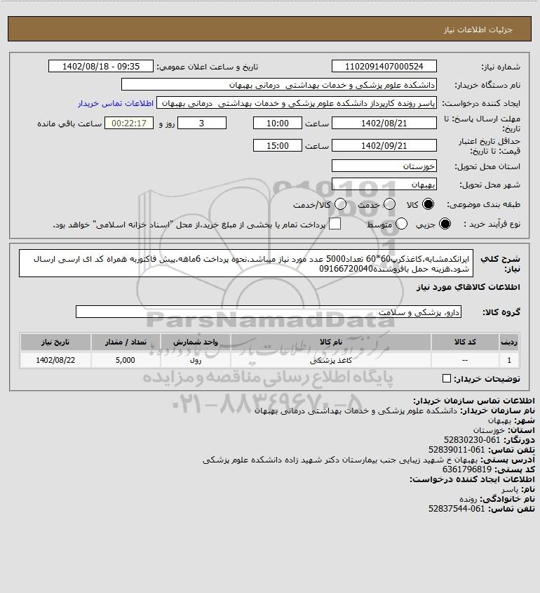 | 1 | -- | کاغذ پزشکی | رول | 5,000 | 1402/08/22 |